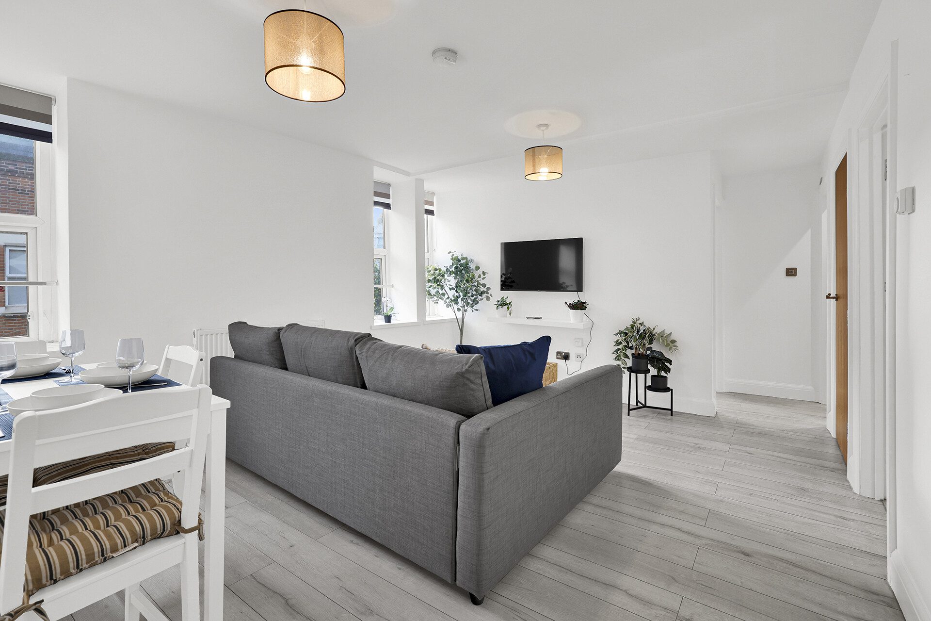 Situated on the second floor and designed with a serene grey palette and clean Scandinavian lines, this apartment feels instantly relaxing from the moment you walk in. The open-plan living, dining, and kitchen area is bright and welcoming, offering a comfortable setting to unwind after a day in the city. The foldable sofa doubles as a cozy extra bed, while the bedroom provides a peaceful retreat complete with soft linens and a gentle, restful atmosphere. The modern bathroom features an over-bath shower and fresh, hotel-quality towels to keep your stay comfortable.