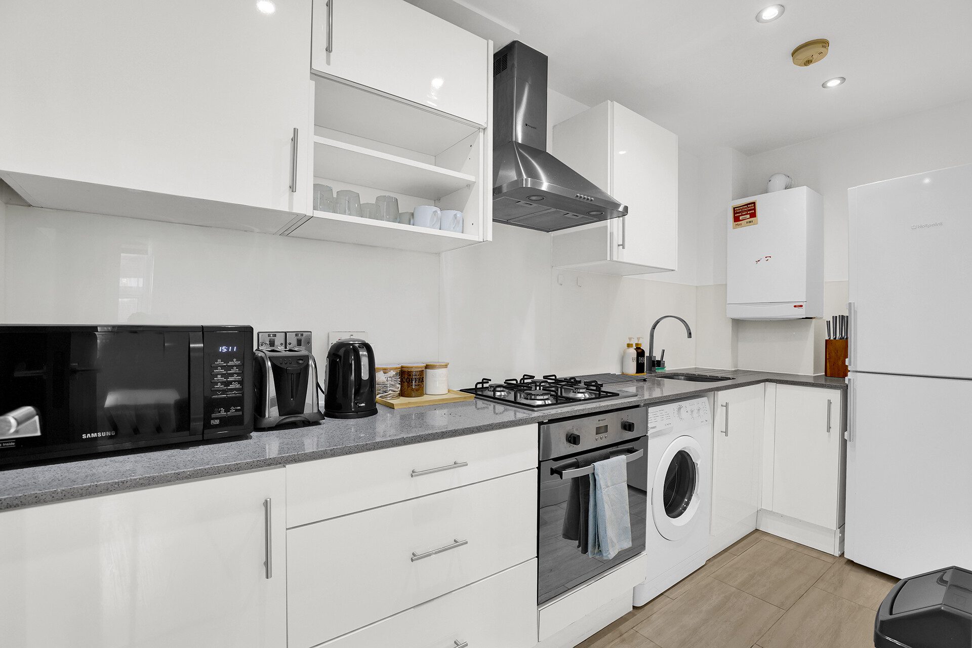 The fully equipped kitchen includes everything you need to prepare meals, from an oven and stove to a microwave, coffee maker, kettle, cookware, and a dining setup that works equally well for relaxed meals or a quiet work session. Whether you’re staying for a weekend getaway, a work trip, or exploring London with friends or family, the apartment is designed to offer both comfort and ease.